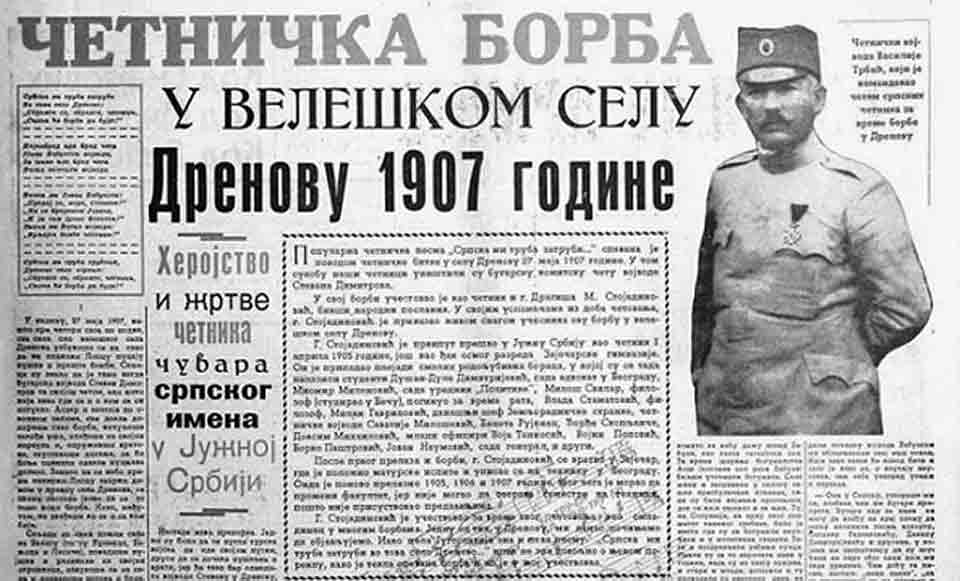 Новински текст Четничка борба у велешком селу Дренову 1907. и војвода Василије Трбић у униформи ЈкВ Фото: Време, 8. октобар 1939. године, стр. 13, НБС